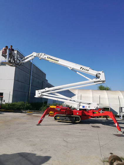 ? 雙鉸鏈?zhǔn)叫”酆蜕炜s節(jié)使得蜘蛛車平臺(tái)高度可以達(dá)到19米,并且2個(gè)人同時(shí)在操作籃內(nèi)操作沒有問題。